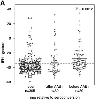 The BABYDIET study led by Annette Ziegler and Ezio Bonifacio collected blood samples longitudinally from 109 children genetically at risk of, but initially unaffected by type 1 diabetes. We were lucky to have access to white blood cells (PBMCs) from these samples and measured the gene expression in them. We were particularly interested in expression of interferon responsive genes, given previous links between type 1 diabetes and infection. Indeed, we saw an upregulation of these genes in children who went on to develop the autoantibodies that are strongly predictive of T1D diagnosis, but, crucially, the upregulation was transient and preceded the appearance of autoantibodies. It was also temporally correlated with recent upper respiratory infection, and may represent a biomarker for the response to infection or the mechanism by which the infection influences type 1 diabetes risk.